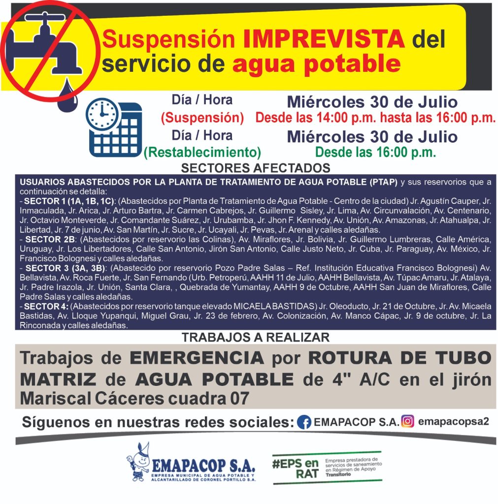 Comunicados 30 julio, 2025 / d_informatica / 0 Comments SUSPENSION IMPREVISTA DEL SERVICIO DE AGUA POTABLE Authord_informatica SUSPENSION PROGRAMADA DEL SERVICIO DE AGUA POTABLE18 julio, 2025SUSPENSION IMPREVISTA DEL SERVICIO DE AGU POTABLE7 agosto, 2025 Related Posts Comunicados PLAN DE REPARTO DE AGUA MEDIANTE CISTERNA 28 agosto, 2025 / d_informatica / 0 Comments Comunicados SUSPENSION PROGRAMADA DEL SERVICIO DE AGUA POTABLE 28 agosto, 2025 / d_informatica / 0 Comments